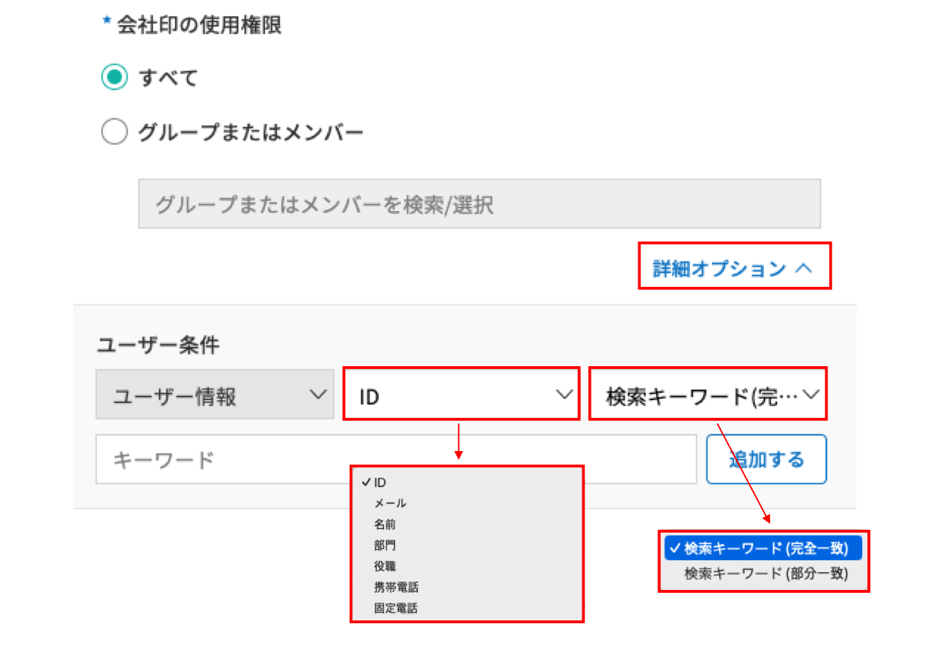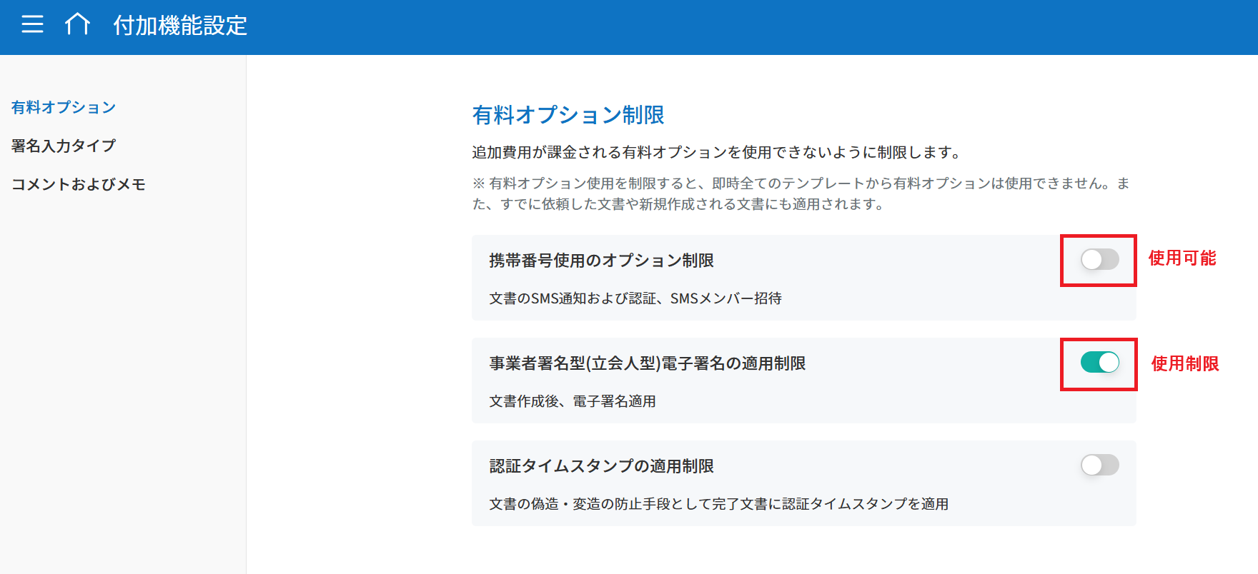 有料オプションの設定: 本人確認やタイムスタンプなど追加費用が発生するオプションの利用可否を設定できます。