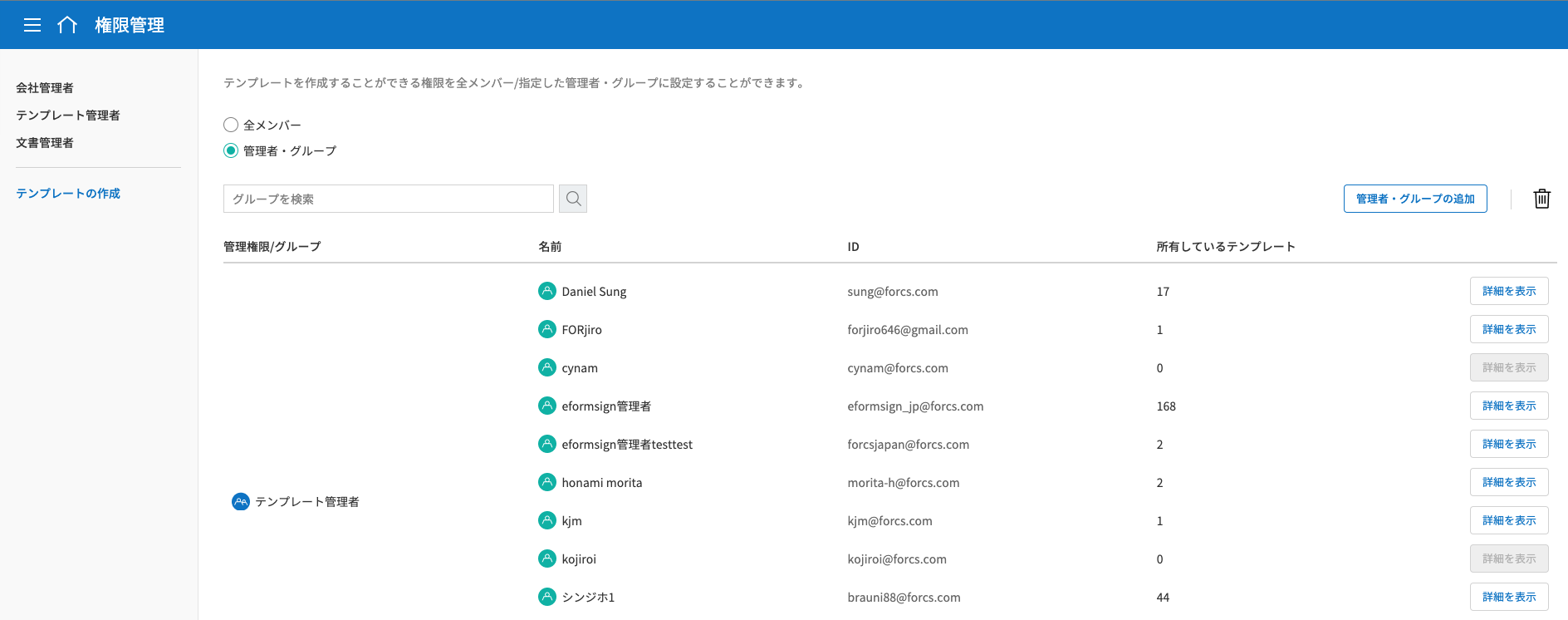 権限管理: メンバーごとに会社管理者、テンプレート管理者、文書管理者権限を付与・管理できます。