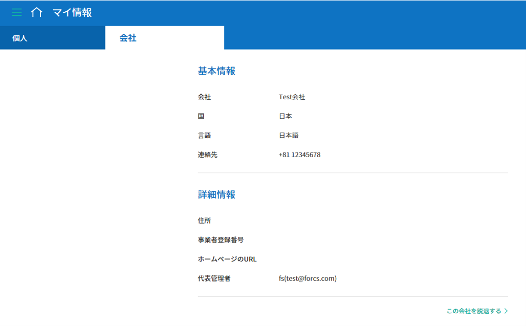 本人が所属している会社の住所、事業所登録番号、ホームページのURL、代表管理者の氏名、メールアドレスを確認することができます。