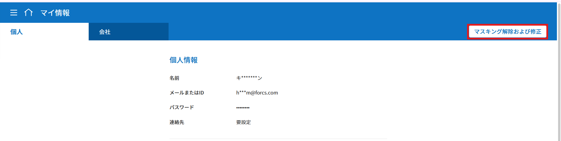 名前やメールアドレスなどの個人情報は、マスキングされた状態で表示されます。 情報を確認・修正するには、画面上部の マスキング解除および修正 ボタンをクリックし、再度パスワードを入力する必要があります。 ※ 「マイ情報」メニュー内での移動(個人 ↔ 会社)の場合は、再認証は不要です。