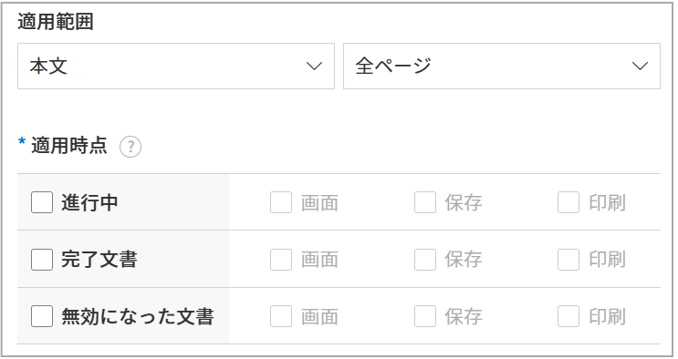 適用時点: 文書ステータス(進行中/完了/無効になった文書)ごとに、 画面, 保存, 印刷 の各時点で適用。