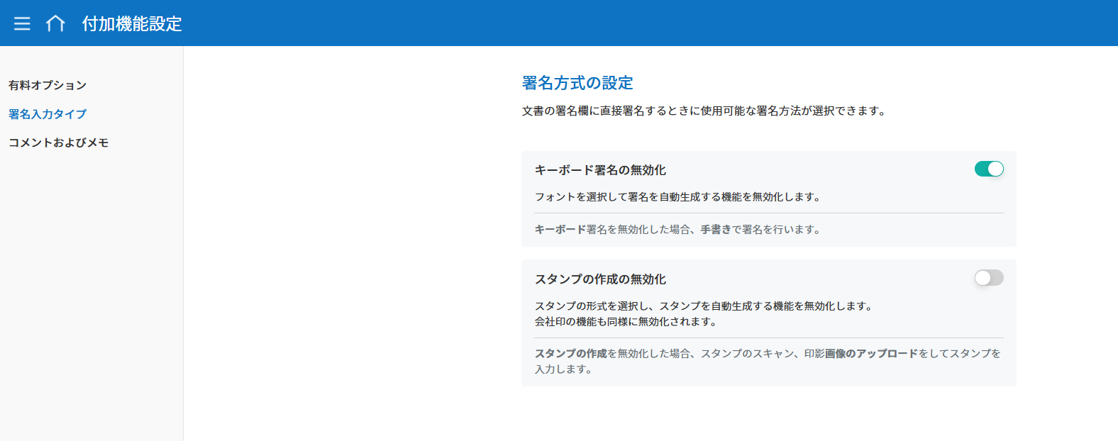 署名方式の設定: 署名時に、署名の入力方式を制限または許可することができます。(テキスト署名およびスタンプ作成による署名入力方式)