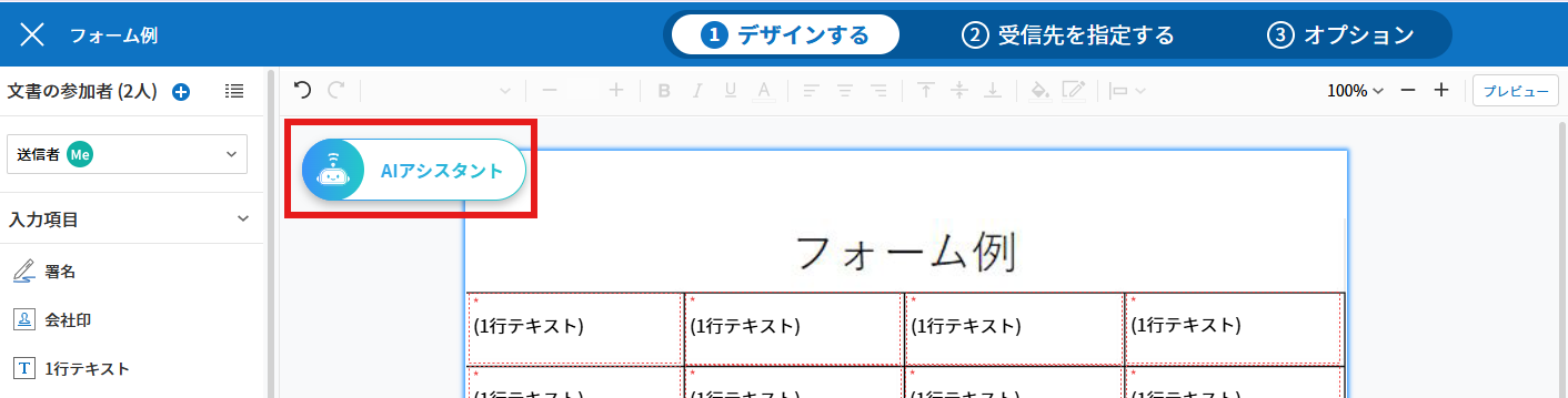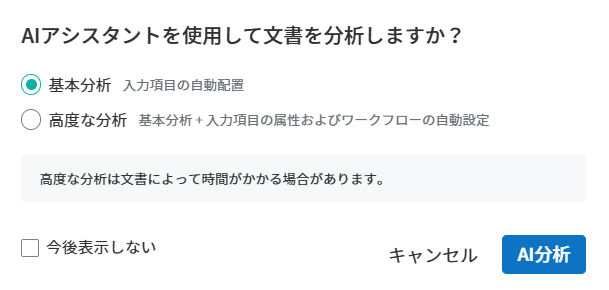 💡 AIアシスタントを使用すると, AIが文書を自動的に分析し、入力項目の位置や種類を自動で設定・配置します。