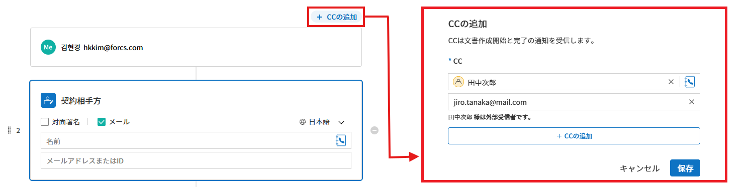 文書の受信者は、 参加者、検討者、閲覧者に分けられます。文書の作成時に追加された参加者が 受信先を指定する ステップに表示され、文書の処理プロセスに応じて検討者と閲覧者を追加することができます。 受信先の指定するから参加者、検討者、閲覧者を削除/追加することができます。各受信者のメールアドレスなどの連絡先情報を入力して詳細な設定を行います。