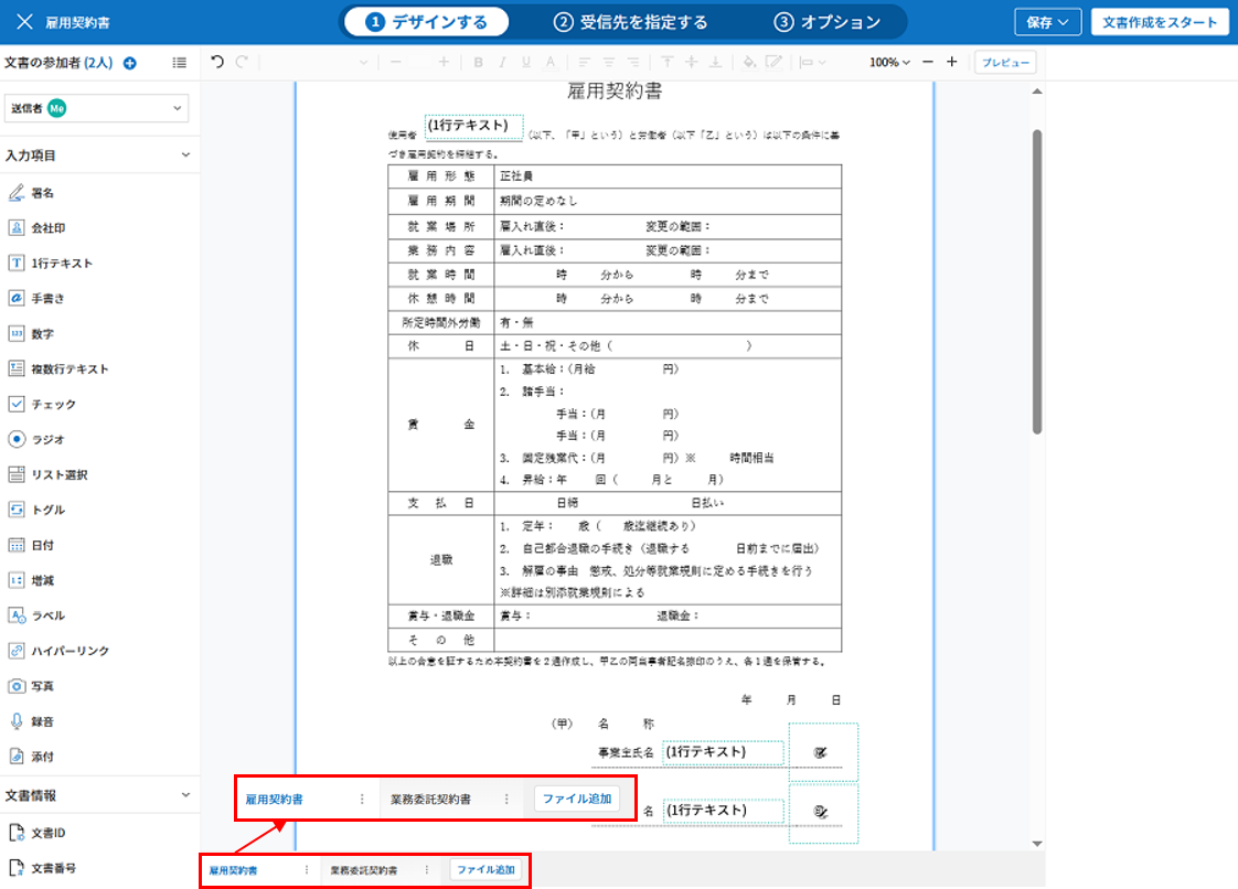 デザインする ステップで文書作成に参加する参加者(文書の受信者)を追加して各受信者の入力項目を設定します。