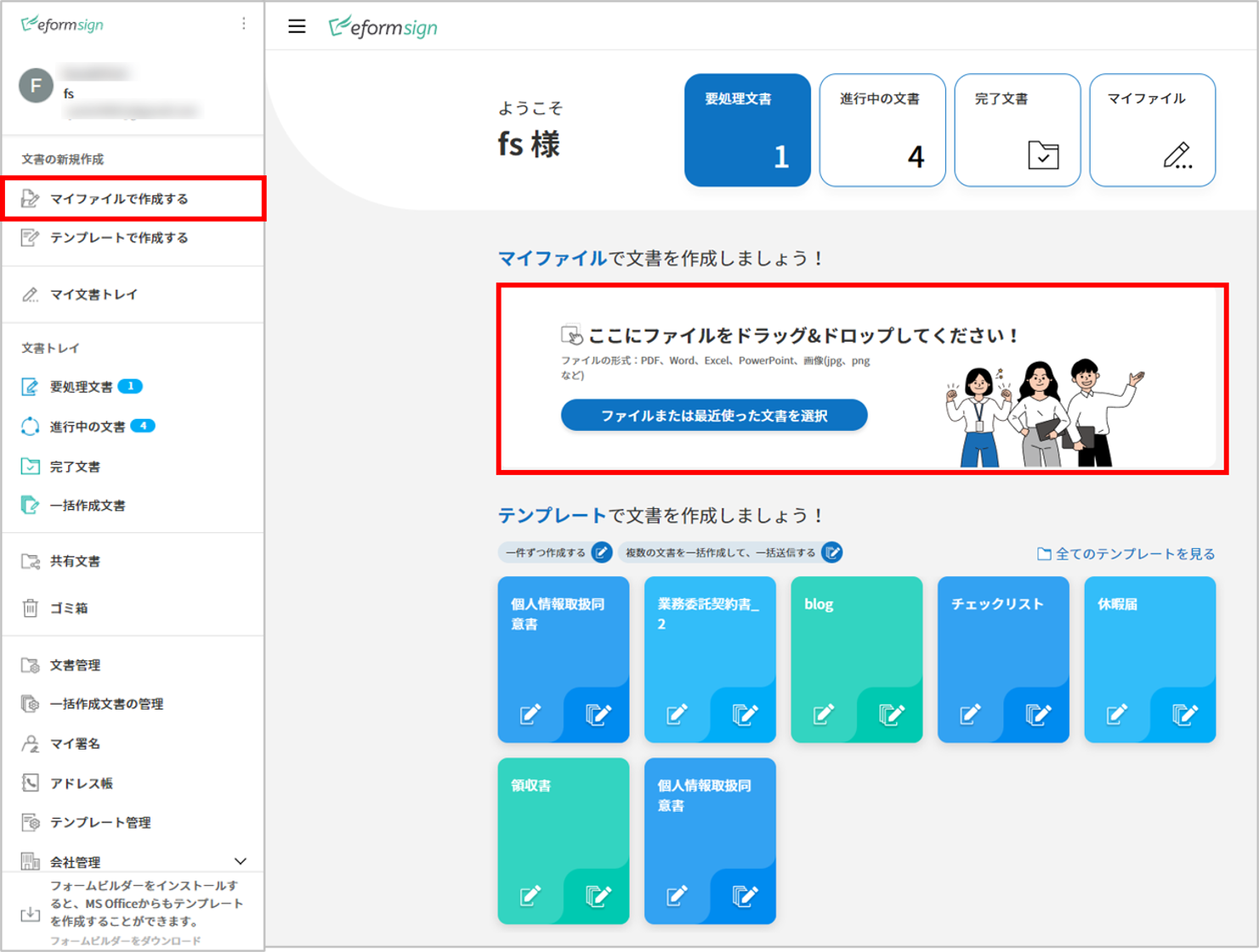 マイファイルで作成する:PC内の既存の文書ファイルを使用して文書を作成し、受信者に送信することができます。1回のみ使用する文書はこちらから作成します。