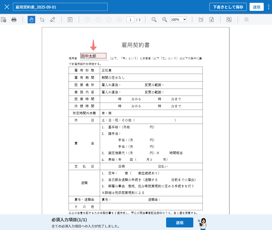 文書を確認し、 送信 をクリックすると、受信先に文書が送信されます。