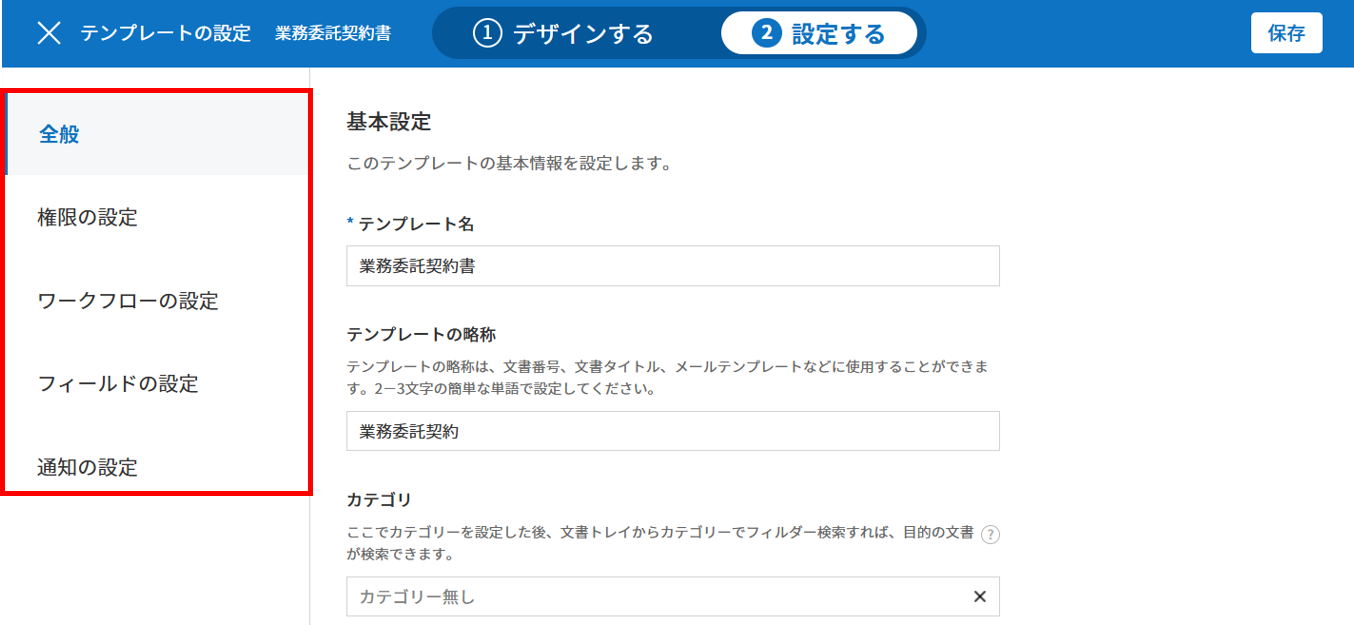 全般: テンプレート名、略称、文書のタイトル、文書番号などを設定します。