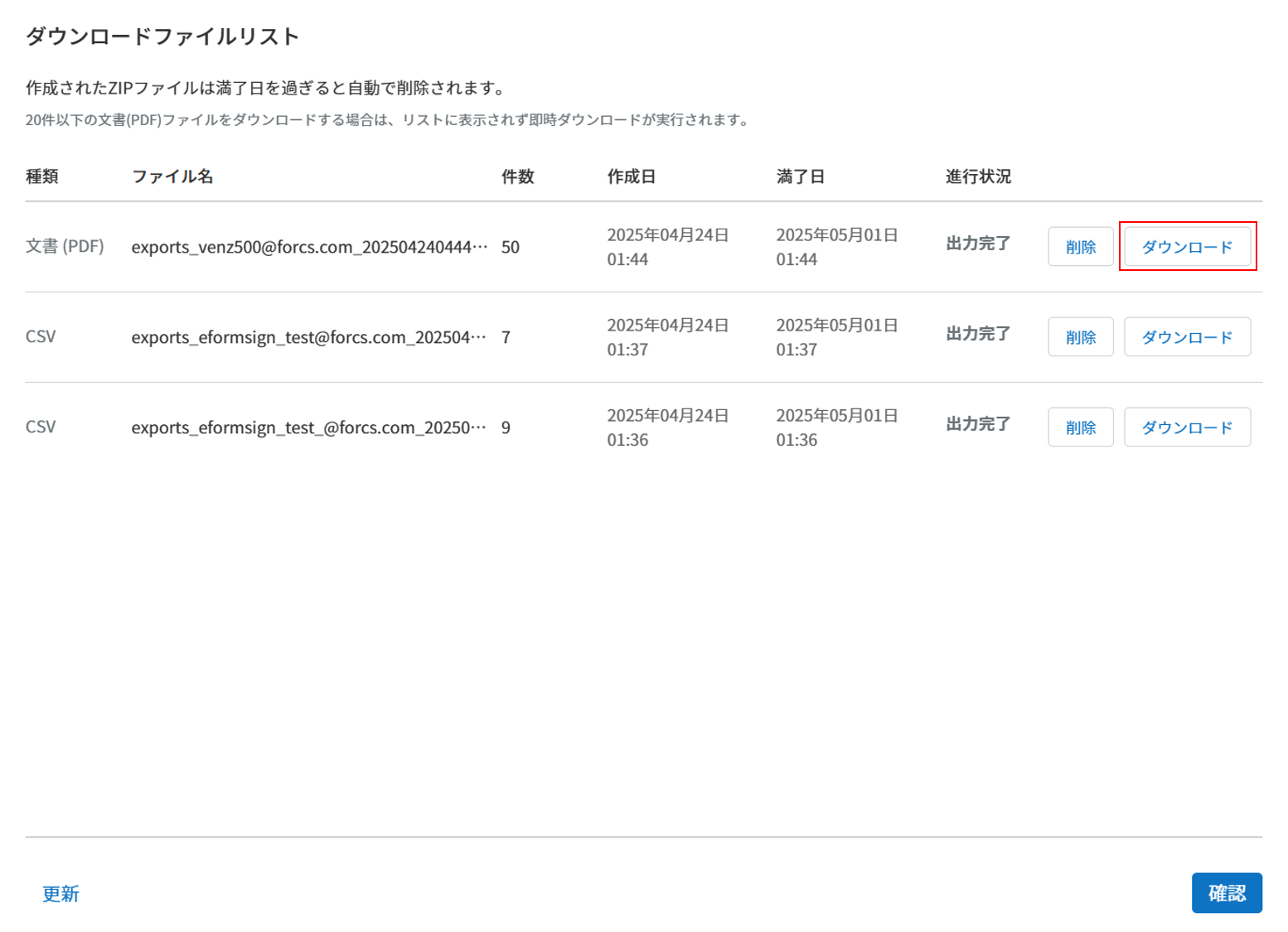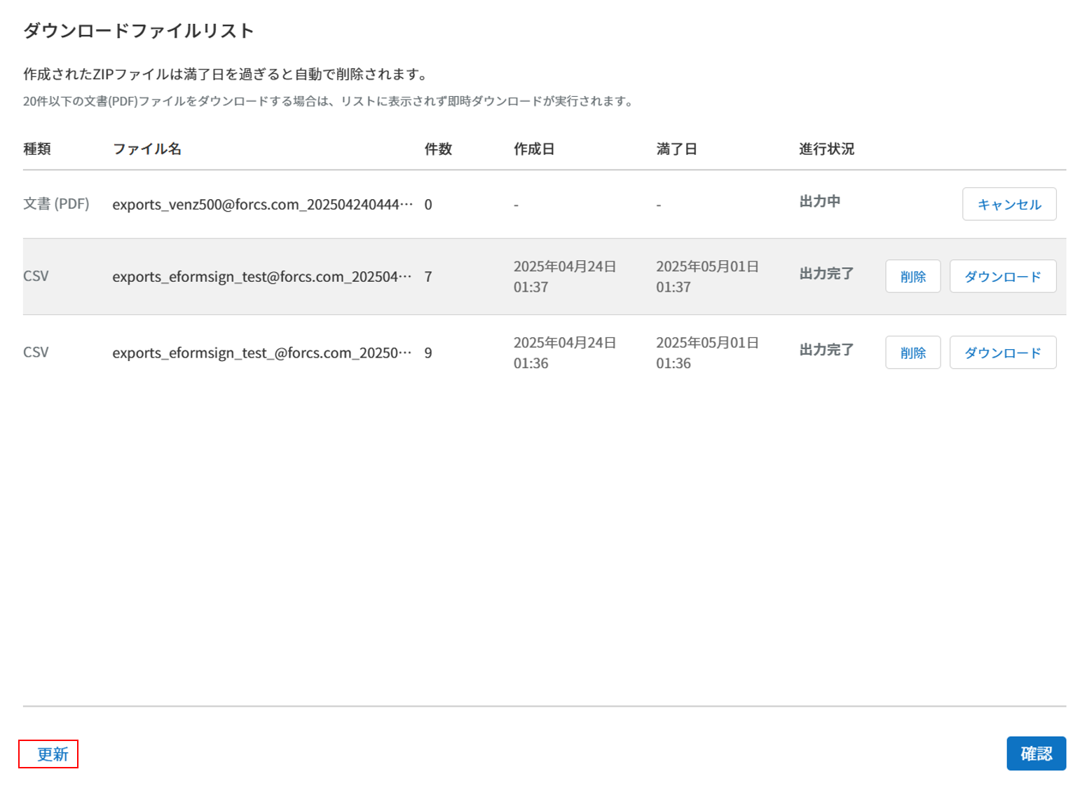 ダウンロードファイルリスト ポップアップで左下の更新をクリックすると、 ダウンロード ボタンが活性化されます。 ダウンロードをクリックすると、ファイルをダウンロードできます。 *データ容量により、ファイル生成時に時間が所要されることがあります。