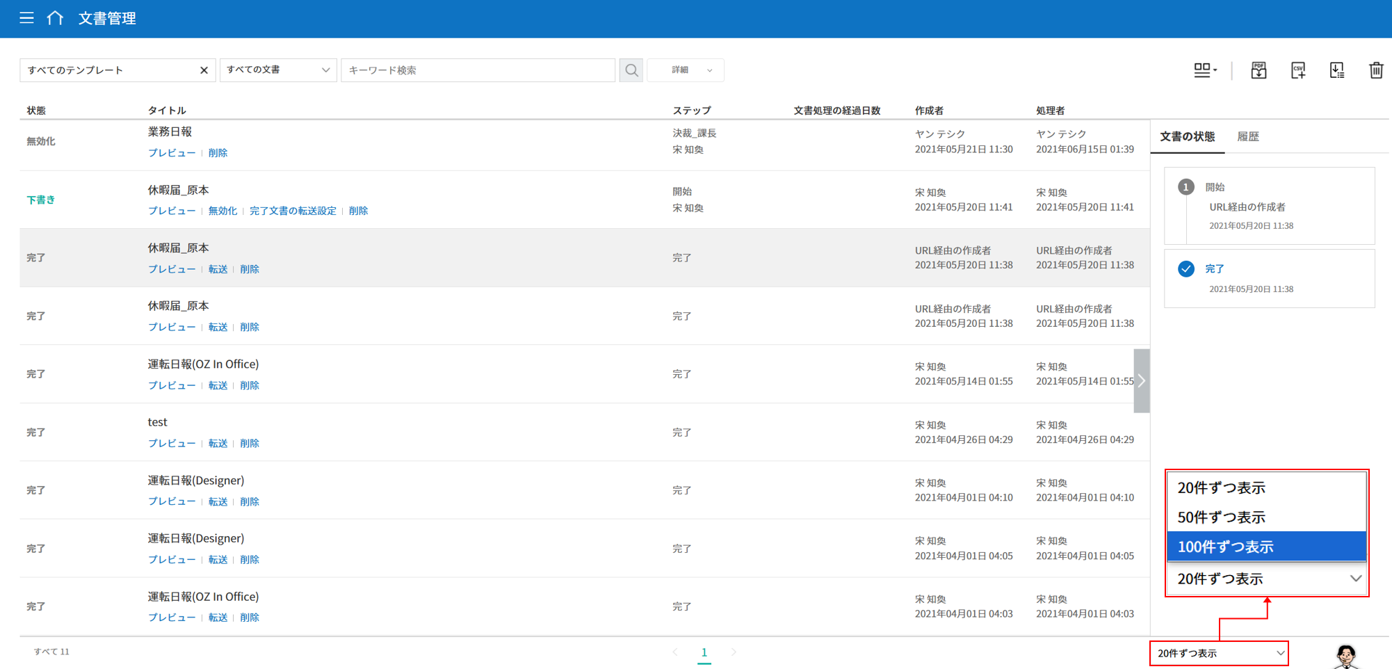 完了文書: 自分が作成した全ての文書のリストを確認できます。