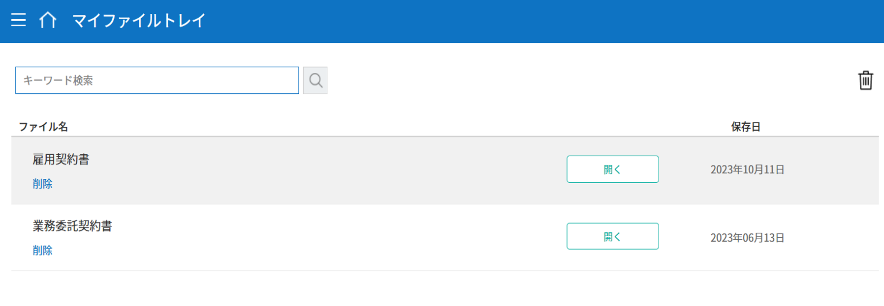 マイファイルトレイ には、 マイファイルで作成する の過程で 文書作成をスタート の前に マイファイルトレイに保存 をクリックして保存した文書が保存されます。